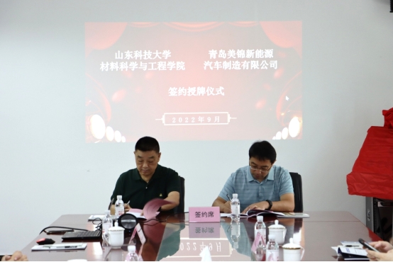 9月8日,beat365亚洲版官方网站beat365亚洲版官方网站同青岛美锦新能源汽车制造有限公司举行校企合作签约仪式。青岛美锦新能源汽车制造有限公司总经理江勇,人力资源中心总监朱彦明,人力资源部部长薛芳,销售部部长江东明;beat365党委书记申兆亮、新能源材料与器件系教授姚树玉、系主任韩野、金属材料工程系副主任朱慧灵、新能源系教师刘瑞、王相南参加了仪式。
