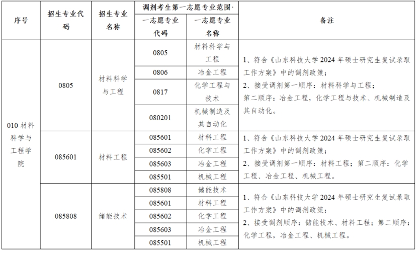 4、数学一、二及英语一、二间可顺向调剂(例如:数学一可以调剂到数学二、英语一可以调剂到英语二),反之不可调剂。初试科目详见学校2024年硕士研究生招生专业目录(https://yjsy.sdust.edu.cn/zhaosheng/info/1120/1524.htm)