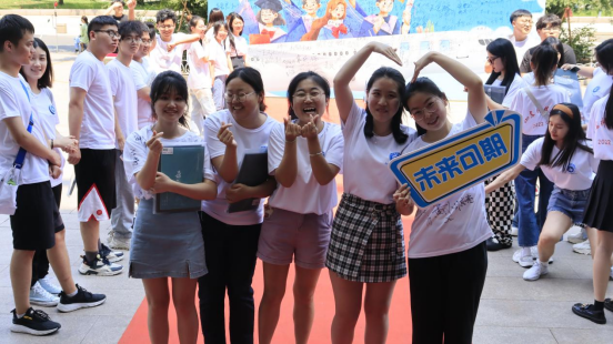红毯两侧掌声响起,身着学士服的毕业生们映入眼帘,他们有的成双成对、有的搭了起人桥。他们在签字墙上留下自己的名字,等待着伴侣送上鲜花,向站在两侧的老师、同学挥手告别,仪式感满满。这条重温“大学成长路”的红毯如同回家之路,连接着同学们与老师的回忆与过往。