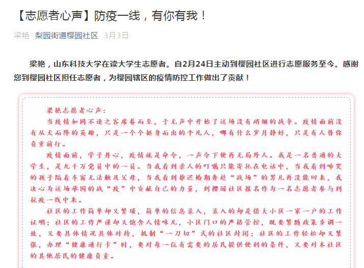 梁艳,金属16-1班学生,家住潍坊市梨园街道樱园社区。作为一名党员,积极参加社区的志愿服务队,受潍坊市团市委表彰,相关事迹被梨园街道樱园社区公众号报道。(李坤)