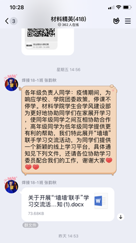 为进一步适应新冠感染肺炎疫情导致延期开学的新形势,全面推进学生学风建设,beat365通过每周召开视频会议,与各学生组织负责人研究学风建设工作,调动学生组织工作的积极性和主动性,创新开展了“墙墙”联手、“学霸课堂”线上分享、成绩帮扶计划等一系列学风建设推进活动。