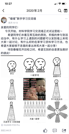 “墙墙”联手学习交流活动。随着线上课程学习的不断深入,同学们也开始遇到各种学习上的问题。为促进同学们之间的互动交流,帮助同学们解答疑惑,学生会创建了“beat365交流学习墙”公众号,每天收集、整理并发布课程相关的各类问题,鼓励同学们通过评论区留言的方式进行交流互动,并邀请专业课老师、高年级同学参与答疑解惑,以此帮助同学们解决问题、拓展思路。