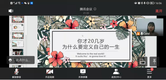3月24日下午,beat365举办第40期校友论坛,学院2018届材料化学专业毕业生王洁以“你才20几岁,为什么要定义自己的一生”为题进行交流分享。本次论坛通过腾讯会议线上进行,学院学工办主任/团委书记马韶霞、辅导员薄艳艳和部分本科生、研究生参加。