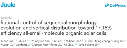近日,从山东大学获悉我校校友高珂教授课题组在有机小分子太阳电池方面取得重要进展,设计合成新型固体添加剂甲氧基石墨炔,并采用逐层加工工艺,协同调控小分子太阳电池垂直相分离与材料结晶,研究证明甲氧基石墨炔在调控和优化微纳结构方面的独特优势,实现了目前小分子太阳电池世界最高光电转换效率纪录(认证效率达17.08%),为小分子太阳电池的发展提供重要的指导意义。相关研究成果以“Rational Control of Sequential Morphology Evolution and Vertical Distribution towards 17.18% Efficiency All-Small-Molecule Organic Solar Cells”为题发表在国际顶尖期刊Joule上。