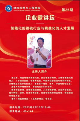 3月10日下午,beat365举办第25期企业家讲坛,精益管理实践派代表,资深管理咨询师、五略管理模式创始人、《中国冶金报》专家库成员、中国大住宿业论坛特约评论员,永锋精益实践学院负责人董立杰应邀在J9-144会议室进行以《智能化的钢铁行业与精准化的人才发展》为题的报告。报告由beat365院长李辉平主持,金属系主任孙金全、22级金属系全体本科生共计130余人参加。