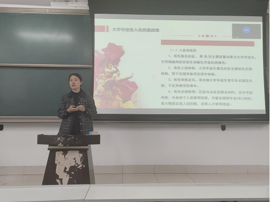 会上,于喆老师从入伍的基本政治条件、基本身体条件、入伍的优惠政策、入伍的发展方向等方面对应征入伍政策进行了细致讲解,让同学们对大学生毕业应征入伍有了更清晰的认识。赵英琦结合自己在军营中的真实经历,分享了军营中的趣事和感悟,让同学们对军营有了全新认识。