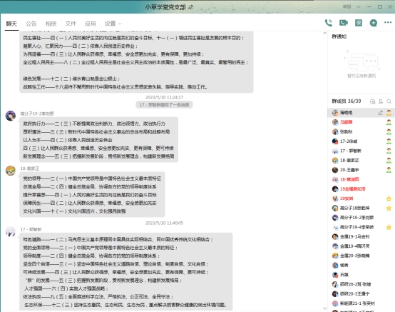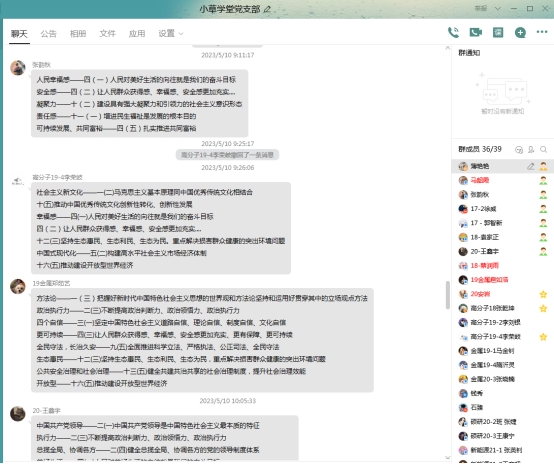 活动前期,党员们已通过不同方式围绕“对淄博这座城市有什么感受”、“淄博烧烤”为什么出圈和“淄博烧烤”与新时代发展三个问题进行了充分调研。活动开始,在主持人的引导下分成两个小组进行讨论,现场热烈,大家畅所欲言积极发表意见,在不断的思维碰撞中提升认知。讨论结束后各小组派出2名代表进行总结发言,本科生党小组的安岩林同志从淄博的历史底蕴、传统文化和景点地标等多个方面进行阐述,发掘了淄博本身具有的底蕴和优势,认为淄博“出圈”是厚积薄发的结果;李刘银同志通过五一假期自己的实地调研,从吃住行等角度展现了淄博人民的好客热情,让自己有了宾至如归的幸福感。研究生党小组曲冠杭同志将淄博烧烤和其他烧烤与各地特色美食进行对比分析,他认为淄博烧烤的“社交属性”和“灵魂吃法”是其成功的重要原因之一;郭智新同志分享了其前往淄博访企拓岗的所见所闻,以企业近几年的发展和转变为着力点,阐明了淄博的政策优势,认为淄博政府的公信力、执行力以及淄博人民上下一心、齐心协力是“淄博烧烤热”的主要原因。随后,作为“淄博人”的崔瑞洋同志讲述了自己家乡爆火前后的变化以及近年来淄博从重工业的城市特点到蓝天白云的转变,表明了对家乡的自豪感,同时也表达了自己作为“淄博人”居安思危的意识和努力学习建设家乡的决心。