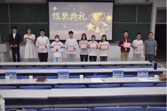 比赛分为初赛和决赛两个阶段,初赛为基础知识竞赛,以笔试形式进行,由初赛成绩决出6支队伍进入决赛。决赛分答题环节和竞技环节两部分,答题环节又包括“齐心协力(必答题)”和“狭路相逢(抢答题)”两个模块;竞技环节又包括创意答辩与文献讲解两个模块。最终决出一等奖一组、二等奖两组、三等奖三组,欧阳晓硕荣获“材料之星”称号。