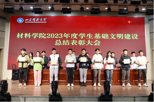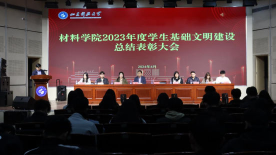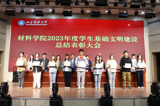 为充分发挥优秀榜样引领作用、推进学院基础文明建设,4月9日晚,beat365于大学生活动中心二楼举办2023年度学生基础文明建设总结表彰大会暨“闪耀材料”十大学生颁奖仪式。beat365党委副书记兼副院长李建楠、学生工作部(处)公寓管理服务中心于海峰老师、全体辅导员、学院学生代表及受表彰先进集体和个人代表参加了大会。会议由辅导员林振德主持。