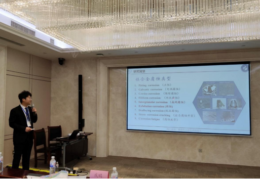 刘成宝老师和蔡磊同学分别做了题为《海洋防腐涂层损伤自预警与自修复技术研究》、《Mg-4Li-1Ca 合金在人体模拟体液中的剥蚀与防护》邀请报告。