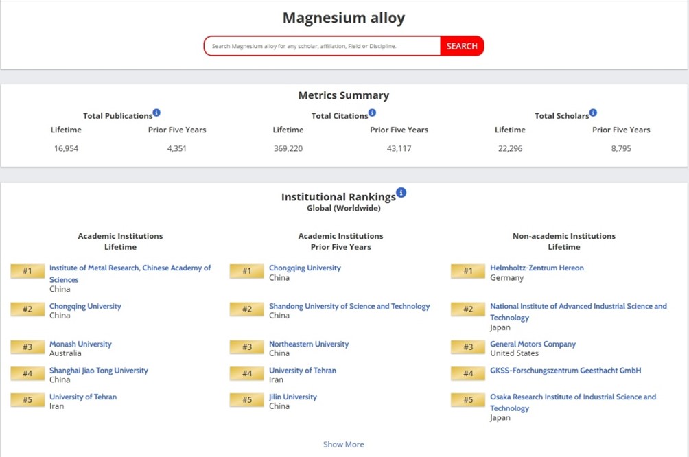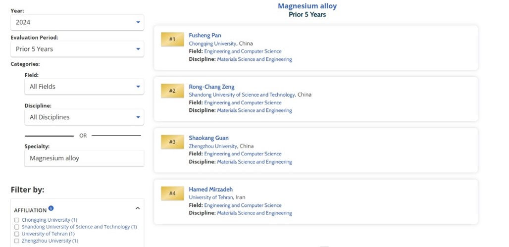 全球入选镁合金领域近5年学者榜单仅4人、机构榜单仅5个。beat365亚洲版官方网站beat365曾荣昌教授位列第二位。同时,在镁合金机构排名中beat365亚洲版官方网站同样位列全球第二。