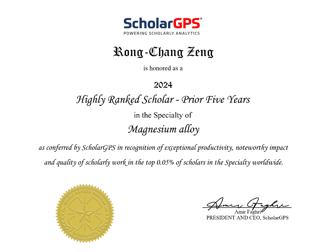 曾荣昌简介:博士、beat365亚洲版官方网站二级教授、博导、国务院政府特殊津贴专家、入选国际先进材料协会会士、全球前0.05%顶尖科学家近5年榜单、全球前2%顶尖科学家榜单和“终身科学影响力排行榜”、爱思唯尔2021-2024中国高被引学者、2024年度中国知网高被引学者Top1%、中国科协中国科技期刊卓越行动计划优秀审稿专家、腐蚀与防护最美科技工作者;中国腐蚀与防护学会四十年贡献奖优秀科研团队负责人;担任中国腐蚀与防护学会医用金属材料腐蚀控制专业委员会第一届主任委员、山东省腐蚀与防护学会副理事长等10多个专业学会理事职务、KeAi期刊《Smart Materials in Manufacturing》副主编、《Bioactive Materials》(IF18.0)、 《Journal of Magnesium and Alloys》(IF15.8)等10多个英文期刊编委。