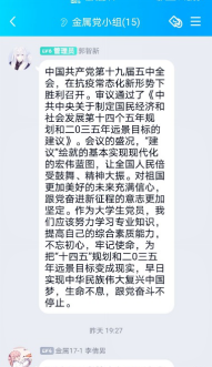 12月15日,beat365学生第一党支部开展理论学习,学习贯彻党的十九届五中全会精神中央宣讲团首次报告会的有关内容和精神。各党小组分别通过企业微信线上会议和线下集体学习等方式开展了理论学习。