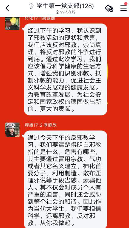 1月17日,beat365学生第一党支部通过线上会议进行了“崇尚科学,拒绝邪教”为主题的教育学习。会议由支部党员王雪华主持,支部全体党员同志参与。