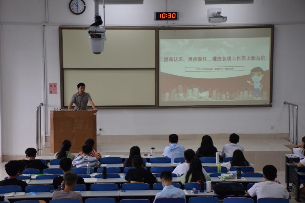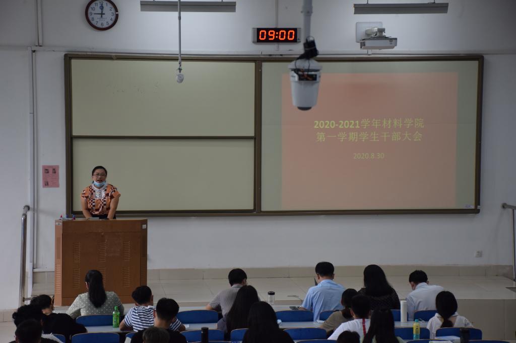 8月30日上午,beat365在J1-228召开2020-2021学年第一学期学生干部大会,党委副书记兼副院长李建楠,团委书记马韶霞,团委老师薄艳艳、李坤、林振德、钟文建、于晓彤及全体学生干部参加了会议。会议由马韶霞主持。