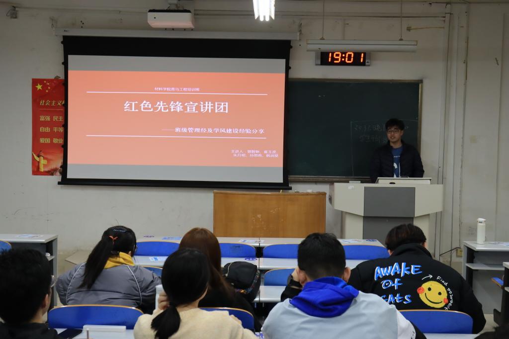 3月5日、6日,beat365红色先锋宣讲团暨青马工程培训班在J3-106举行“班级管理经验及学风建设经验分享”主题宣讲。院学生会主席韩润昊,2017级金属1班郭智新,2018级新能源崔玉波、朱月明,2018级金属1班孙思雨以及大一大二年级全体学生干部参与此次宣讲会。