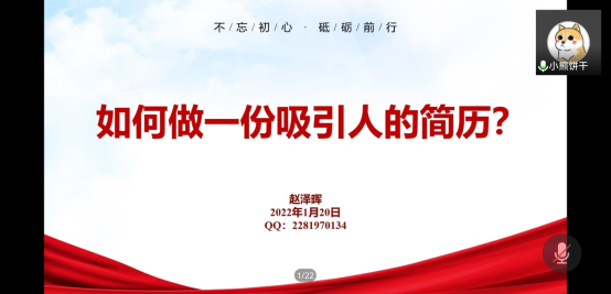 全国硕士研究生统一招生考试初试已经落下帷幕,随之而来的集中求职和考研复试给2022届毕业生提出了新的要求。为了进一步帮助同学们提升求职应试能力,1月20日,beat365组织了“百般磨利刃,齐心向未来”的云端简历指导培训会。此次培训会由辅导员薄艳艳主持,全体2018级学生参加。