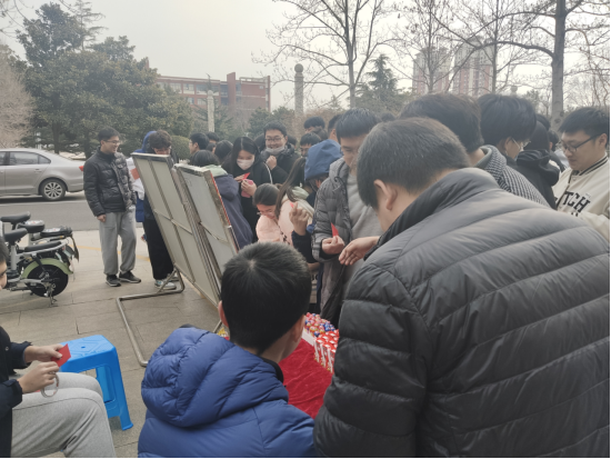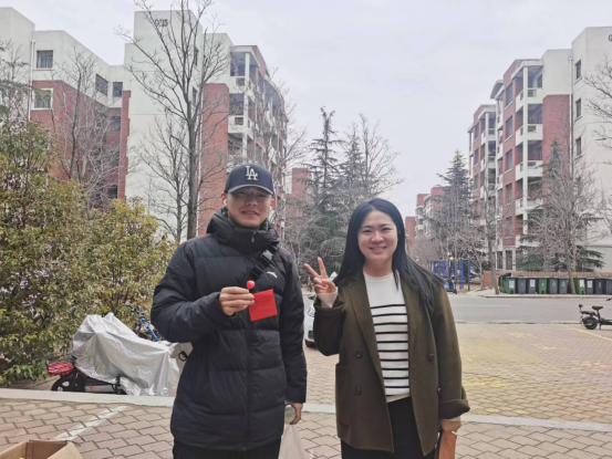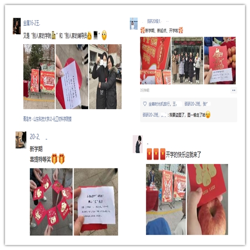 为迎接同学们返校,让同学们携带新春的欣喜步入焕然一新的新学期,学院在办公楼前和宿舍楼下为同学们精心准备了365份“惊喜红包”,送上365份诚挚祝福。红包内放入备注礼物名称和祝福语的纸条。礼物共分为两类,一类是中性笔、苹果、棒棒糖、旺仔牛奶等实物奖品,另一类是美好“食”光卡、暖暖祝福卡和平安守护卡三类特别礼物。抽中特别礼物的同学,可以获得和辅导员相约共进午餐、辅导员手写祝福卡片、辅导员帮助运送行李等互动机会,这样既进一步拉近了老师与同学们之间的距离,又帮助同学们快速全身心投入的新学期学习生活。活动现场,返校同学“三五成群”开心的在“红包墙”上挑选属于自己的好运,兴奋地展示起自己收到的祝福,一派热闹的场景,深切感受到了“回家”的热情与温馨。