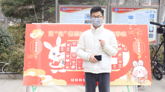 新能源22-2的宋嘉槺,抽到了团委老师的祝福,说到:“新的学期会更加努力,不辜负团委老师的期待。”